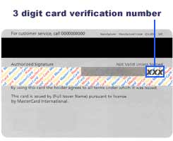 The verification number is a 3-digit number printed on the back of your card. It appears after and to the right of your card number as such: |